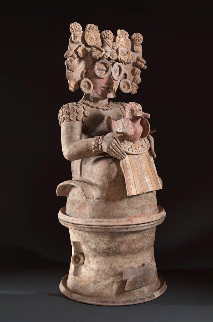 На крышке изображена женщина или женское божество, сидящее и держащее на коленях водоплавающую птицу. Гватемала, 150/200-650 гг. н.э.