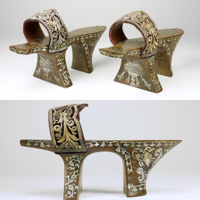 Туфли украшены замысловатой инкрустацией из серебра, перламутра и бархатных ремешков.