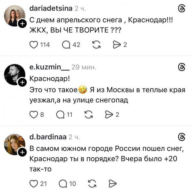 Весна любит устраивать сюрпризы. Только все расслабились и... "бац!" — за окном снова зима. Так, например, в Краснодаре внезапно выпал снег. При этом буквально на днях в городе было +20°C. Соцсети завалили фото и видео, где город резко переобулся из весны обратно в зиму. А как дела с погодой у вас?