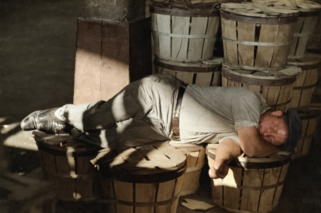 5. Мужчина спит на рыбном рынке. Балтимор, штат Мэриленд. США, 1938 год.