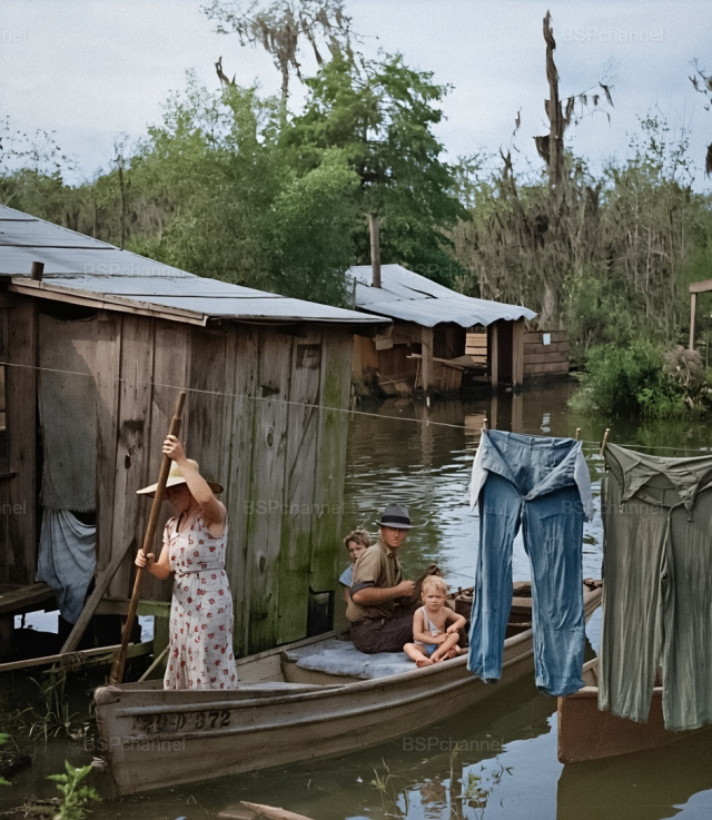 9. Семья рыбака возвращается с ранней утренней рыбалки недалеко от города Эйкерс, штат Луизиана, 1938 год.
