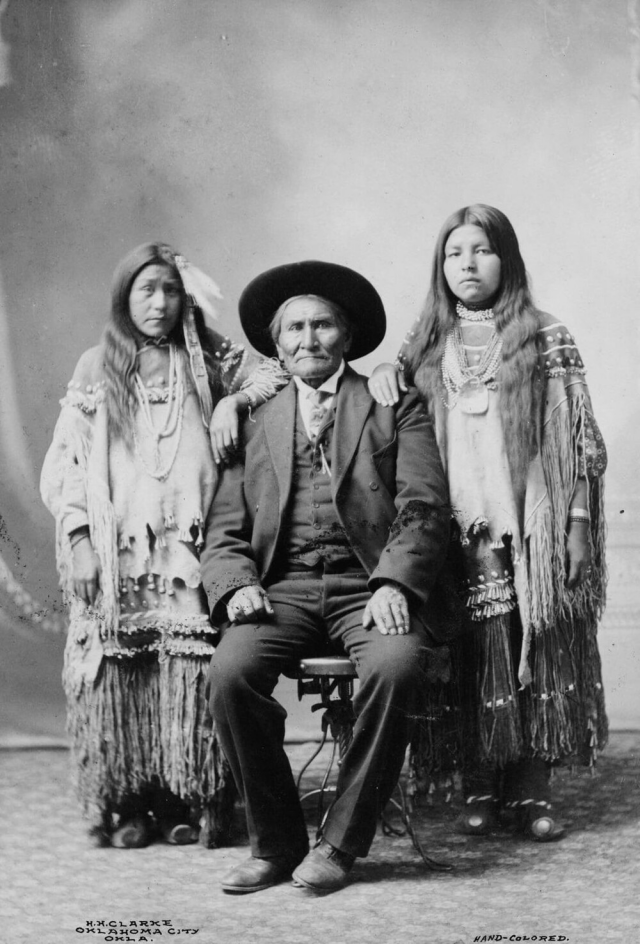 11. Вождь апачей Джеронимо и две его племянницы, 1900 год. Оклахома-Сити, штат Оклахома