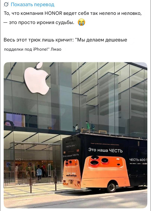 Компания Honor устроила рекламную акцию возле магазина Apple в Гонконге, пригнав туда грузовик с устройством, напоминающим iPhone 17 Pro. По данным наблюдателей, речь идет о промо будущего Honor 600 Pro, который, как утверждается, может получить дизайн, схожий с флагманом Apple. Акция была воспринята как попытка подчеркнуть внешнее сходство устройств при более доступной цене новинки. Событие вызвало активное обсуждение в сети и споры о границах маркетинговых заимствований в индустрии смартфонов.