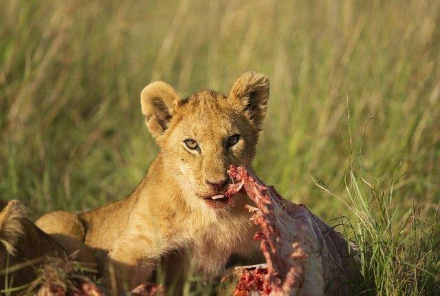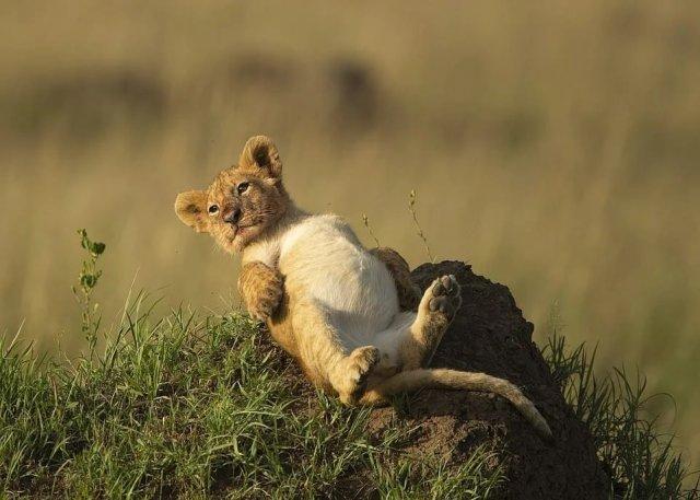 "Я на солнышке сижу, Я на солнышко гляжу, Всё сижу и сижу, И на солнышко гляжу..." - эта песенка сразу же возникает в голове, когда смотришь на этого маленького царя зверей. Фотограф заснял в Африке львёнка, который так сильно наелся, что не мог пошевелиться и просто отдыхал на солнышке.